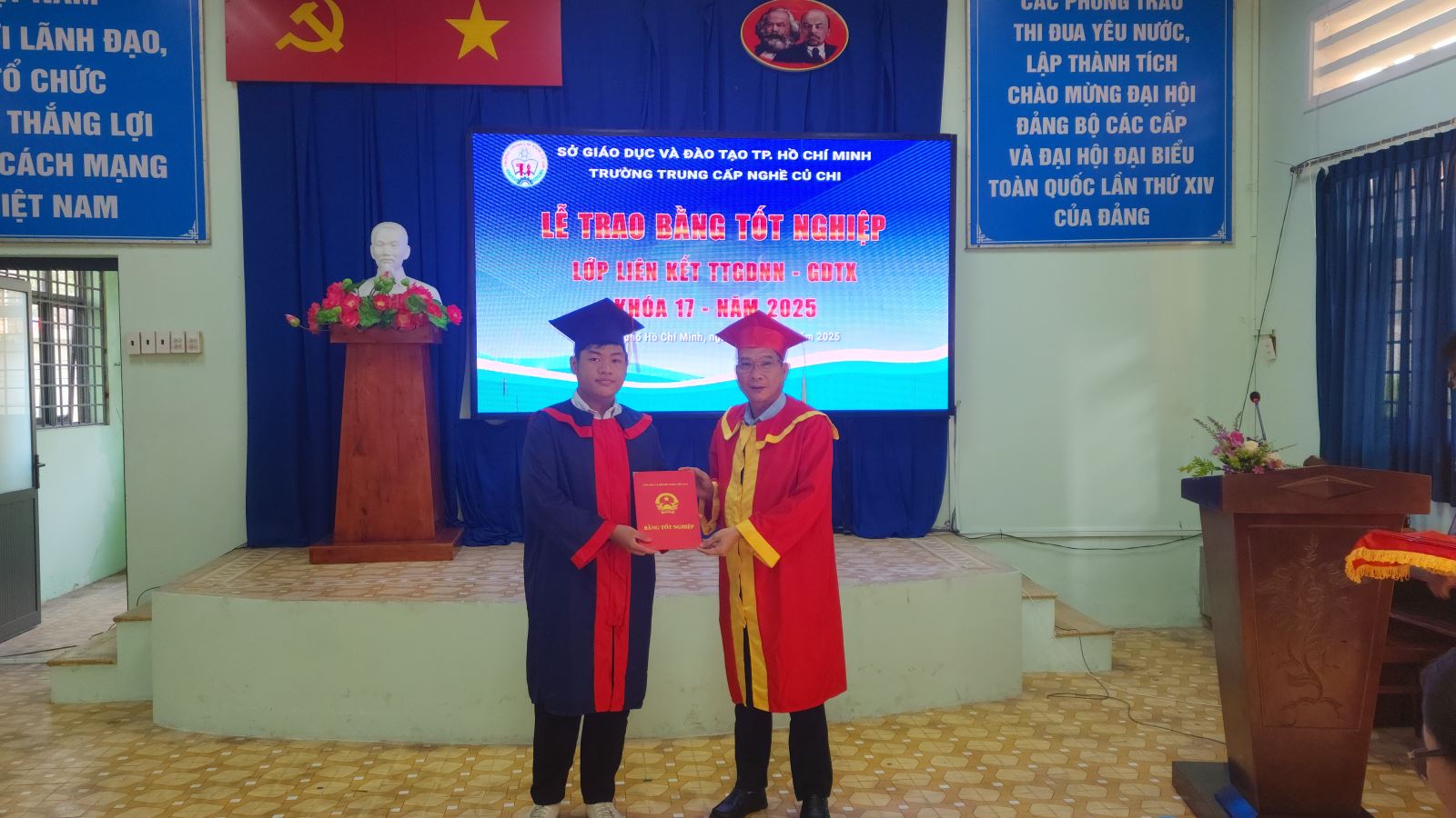 Ngày 02/11/2025, Trường Trung cấp Nghề Củ Chi tổ chức Lễ tốt nghiệp và trao bằng tốt nghiệp Trung cấp cho học sinh. Tham dự buổi lễ có Thầy Phan Thanh Trọng – Phó giám đốc Trung tâm GDNN-GDTX, Thạc sĩ Trần Minh Phụng - Hiệu trưởng cùng các thầy cô Trưởng khoa, giáo viên của nhà trường.